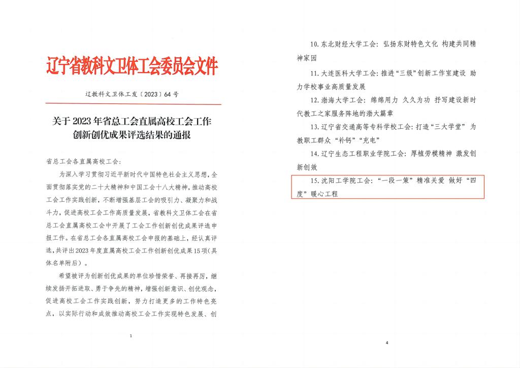 近日,辽宁省教科文卫体工会发布2023年省总工会直属高校工会工作创新创优成果评选结果,我校工会申报的《“一段一策”精准关爱 做好“四度”暖心工程》荣获创新创优成果奖,成为15所获此荣誉高校中唯一的民办高校。