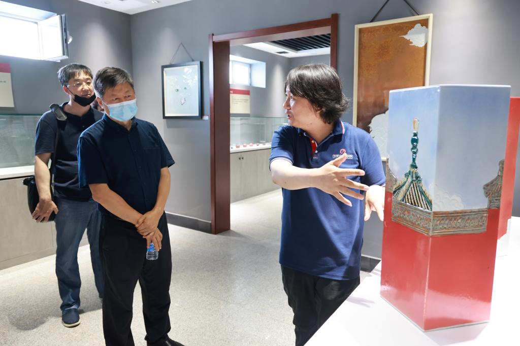 6月20日,辽宁省人大常委会委员、教科文卫委员会副主任委员曾庆捷率调研组来到抚顺大官窑陶瓷文创园,听取我校创新创业学院教师、抚顺大官窑陶瓷非遗传承人王永亮教授关于继承和弘扬大官窑历史文化情况的介绍,对我校近年来重视中华优秀传统文化的创新与发展和以史育人等方面工作给予充分肯定。抚顺市人大常委会副主任张家娟等陪同调研。